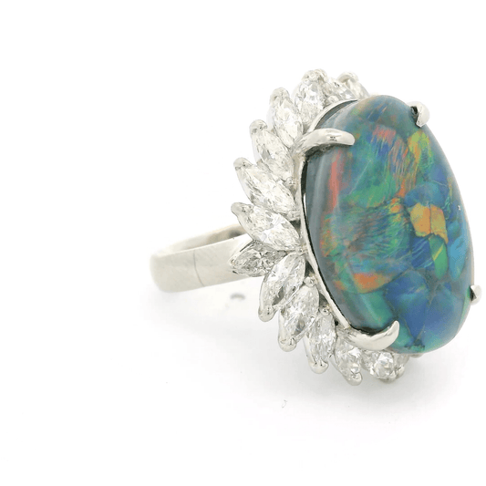 Lightning Ridge Black Opal Ring With Marquise Cut Diamonds