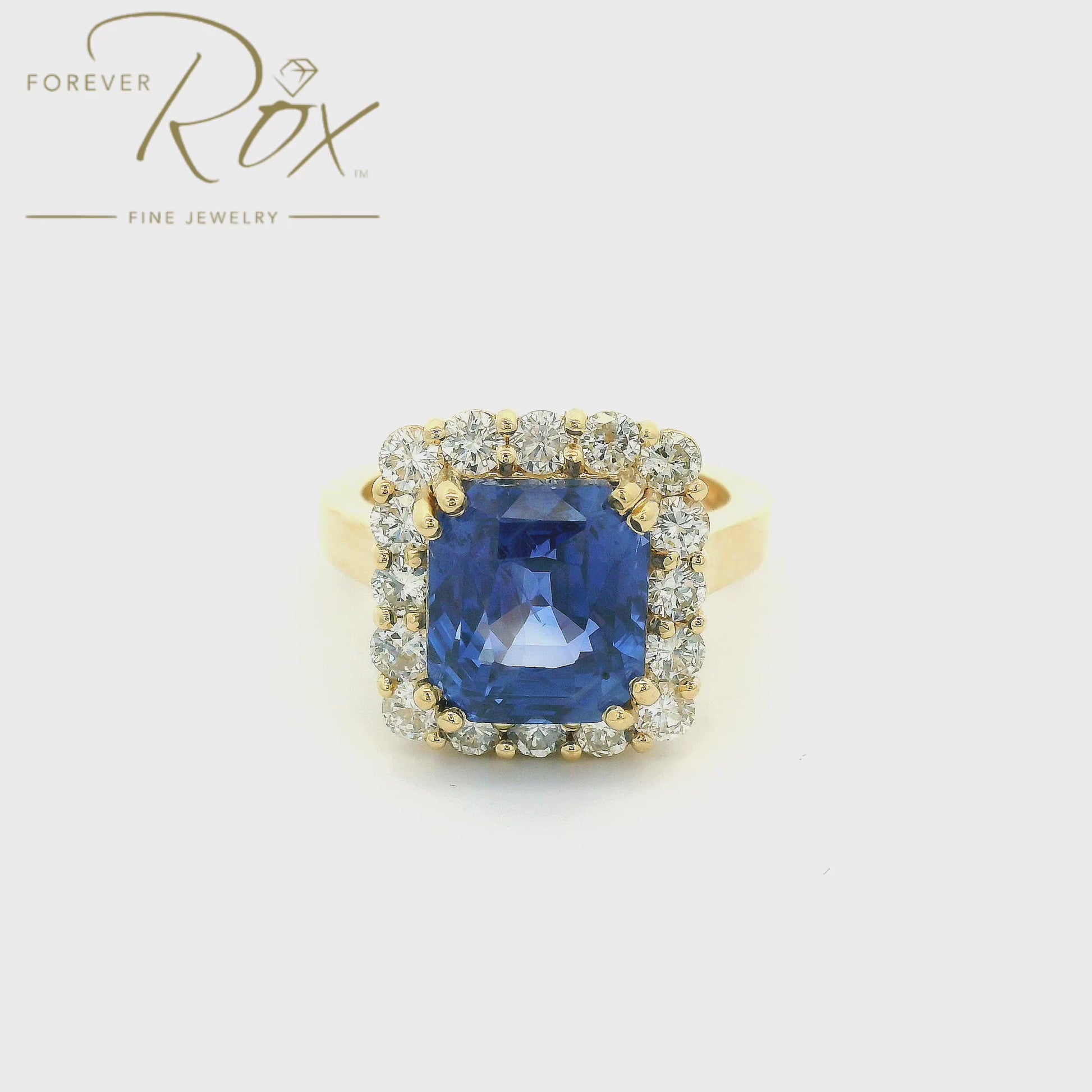 This custom ring is made with one non heat treated blue Sapphire with Diamonds haloing around the stone. the ring is made with a latch latch band to allow for the ring to be easily put on and taken off.